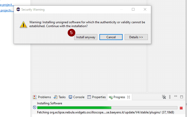 Da das Plugin nicht Signiert ist, muss der installation in Eclipse zugestimmt werden (5).