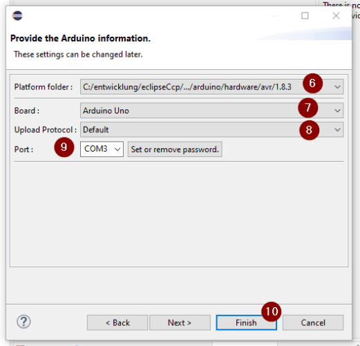 Diese Daten bestätigen wir nun mit der Schaltfläche „Finish“ (10) und es wird das Projekt eingerichtet.