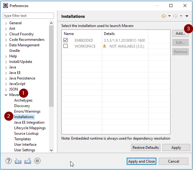 Navigieren wir also über das Hauptmenü „Window“ > „Preferences“ zu den Einstellungen. Dort öffnen wir im Baum den Pfad „Maven“ (1) > „Installations“ (2). Es sollte hier die Vorauswahl „EMBEDDED“ markiert sein (der Haken ist gesetzt).