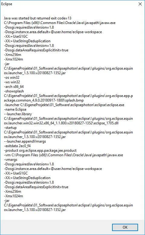 Sollte beim Starten die Fehlermeldung mit dem Fehlercode 13 erscheinen so muss in der Datei „eclipse.ini“ der Pfad zur javaw.exe gesetzt werden.