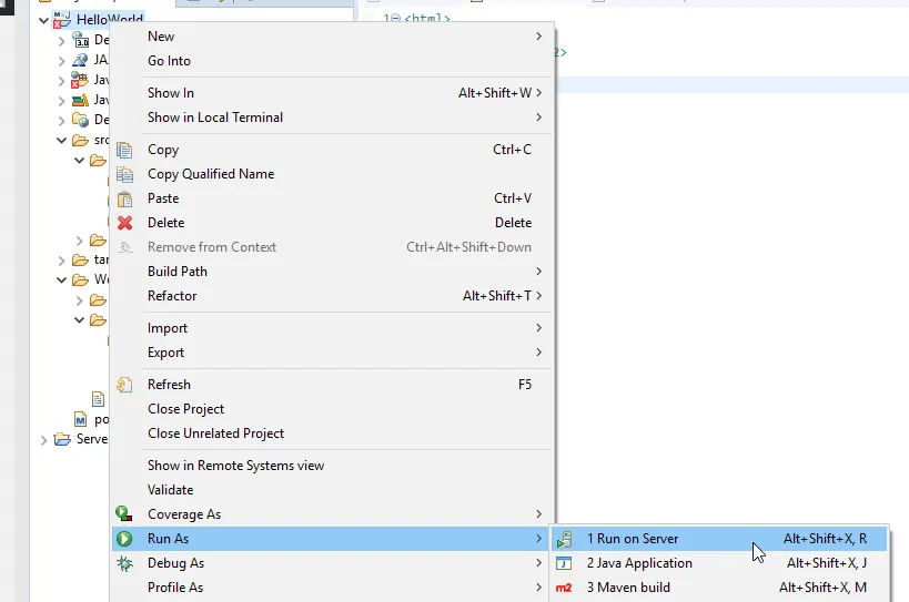 Nachdem nun das Web-Projekt und der Applikationsserver Tomcat eingerichtet wurde können wir diesen erstmalig starten. Dazu klicken wir im Kontextmenü des Projektes auf „Run As“ > „Run on Server“ und wählen dort einen Applikationsserver aus.