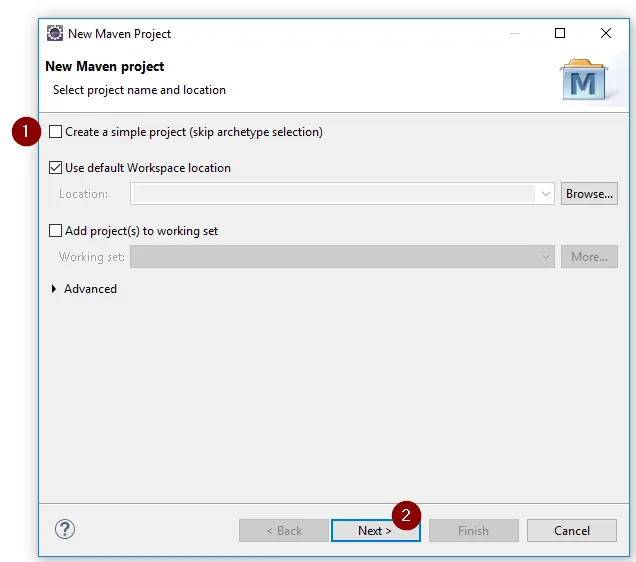 Wollen wir nun unser Web-Projekt mit Apache Maven erstellen, dazu navigieren wir über „File“ > „New“ > „Maven Project“. In diesem Dialog setzen wir den Haken bei „Create a simple project …“ (1) und wählen die Schaltfläche „Next >“ (2).