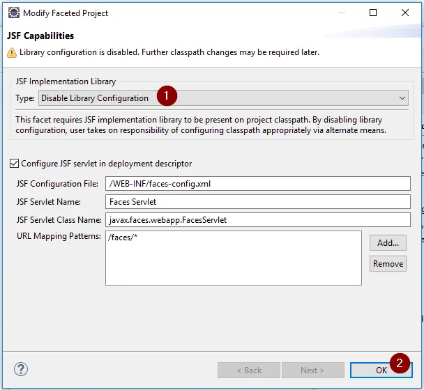 Als „Type“ wählen wir „Disable Library Configuration“ (1) und bestätigen diese Auswahl mit der Schaltfläche „OK“ (2).