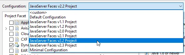 Nun werden noch die Einstellungen für JavaServerFaces 2.2 gesetzt, dazu wird aus der Auswahlliste für die „Configuration“ der Eintrag „JavaServer Faces v2.2 Project“.