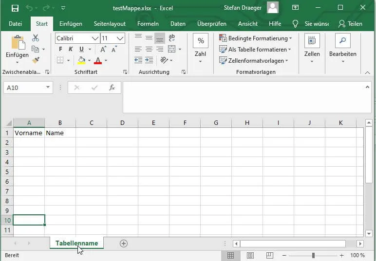 Das Ergebnis ist, das wir eine Datei mit dem Namen „testMappe.xlsx“ und in dieser ein Tabellenblatt mit dem Namen „Tabellenname“ erzeugt haben. Des Weiteren haben wir in die Zellen „A1“ den Wert „Vorname“ sowie in die Zelle „B1“ Name geschrieben.