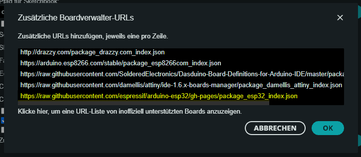 Bevor wir mit der Programmierung beginnen können, müssen wir den Boardtreiber installieren. Den Boardtreiber können wir jedoch erst installieren, wenn wir die nachfolgende Zeile unter den „Zusätzlichen Boardverwalter URLs“ hinzugefügt haben.