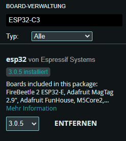 Wenn die URL hinzugefügt wurde, dann können wir im Boardverwalter nach ESP32 oder genauer ESP32-C3 suchen. Es sollte dann der Eintrag „esp32 von Espressif Systems“ angezeigt werden, wo wird die Schaltfläche INSTALLIEREN finden. (In meinem Fall steht dort ENTFERNEN, da ich diese bereits installiert habe.)