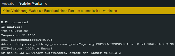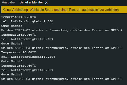 Im seriellen Monitor werden nun auf Knopfdruck die Sensordaten ausgeben und anschließend der bekannte Text „Gute Nacht!“. Der ESP32-C3 legt sich anschließend schlafen und wartet somit auf den nächsten Knopfdruck.