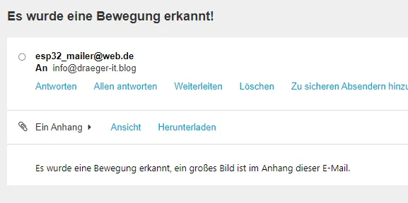 In meinem Fall habe ich die Mail mit Anhang an meinen Account „info@draeger-it.blog“ von der Adresse „esp32_mailer@web.de“ gesendet.