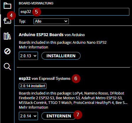 Jetzt können wir zum Boardverwalter (4) wechseln und nach ESP32(5) suchen. Aus der Ergebnisliste wählen wir im Eintrag „esp32 von Espressif Systems“ (6) die Schaltfläche INSTALLIEREN. In meinem Falle ist diese bereits in der derzeit aktuellen Version 2.014 installiert und ich habe hier die Schaltfläche ENTFERNEN (7).