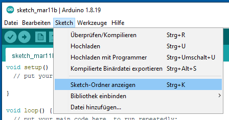 Wir können jetzt mit der Tastenkombination Strg + K oder über das Menü Sketch > Sketch-Ordner anzeigen in den Sketch Ordner wechsel und sollten nun einen zusätzlichen Ordner „data“ sehen.