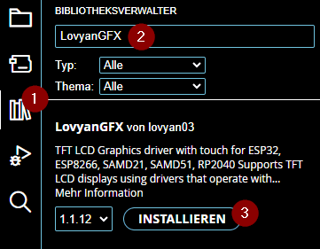 Wie im Beitrag zuvor möchte ich das TFT Display in der Arduino IDE programmieren. Dazu benötigst du eine Bibliothek. Welche du über den internen Bibliotheksverwalter (1) installieren kannst. Wenn dieser geöffnet ist, dann suchst du zunächst nach „LovyanGFX“ und wählst die Schaltfläche „INSTALLIEREN“ (3).