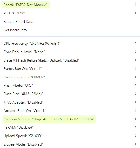 • Partition Scheme: Huge APP (3MB No OTA/1MB SPIFFS)