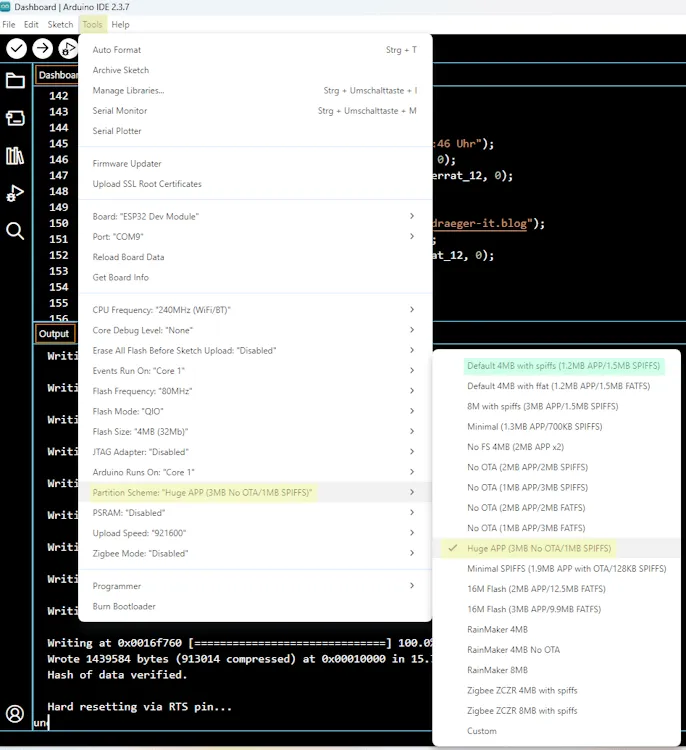 Als Standard ist „Default 4MB with spiffs (1.2MB APP/1.5MB SPIFFS)“ (in der Grafik grün markiert) ausgewählt, dieses ist jedoch für den Code nicht ausreichend und wir müssen hier auf „Huge APP (2MB No OTA/1MB SPIFFS)“ wechseln.
