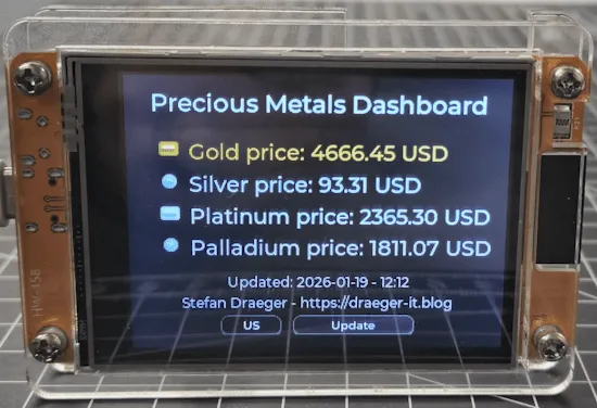 In diesem Beitrag hast du gesehen, wie aus einer einfachen Community-Idee ein vollwertiges kleines Dashboard-Projekt entstehen kann. Auf Basis des ESP32-2432S028 haben wir ein kompaktes System aufgebaut, das aktuelle Edelmetallpreise per WLAN aus einer öffentlichen API lädt, als JSON verarbeitet und übersichtlich auf einem TFT-Display darstellt.