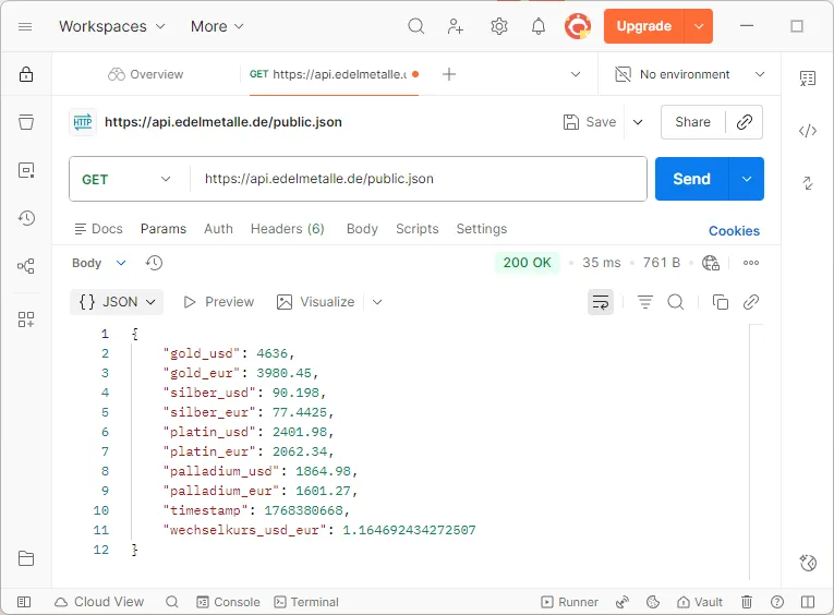 Als Datenquelle nutze ich edelmetalle.de, da sich die aktuellen Preise dort sehr einfach über eine öffentliche JSON-Schnittstelle abrufen lassen. Die API ist frei zugänglich und kann direkt per HTTP-Request abgefragt werden: https://api.edelmetalle.de/public.json