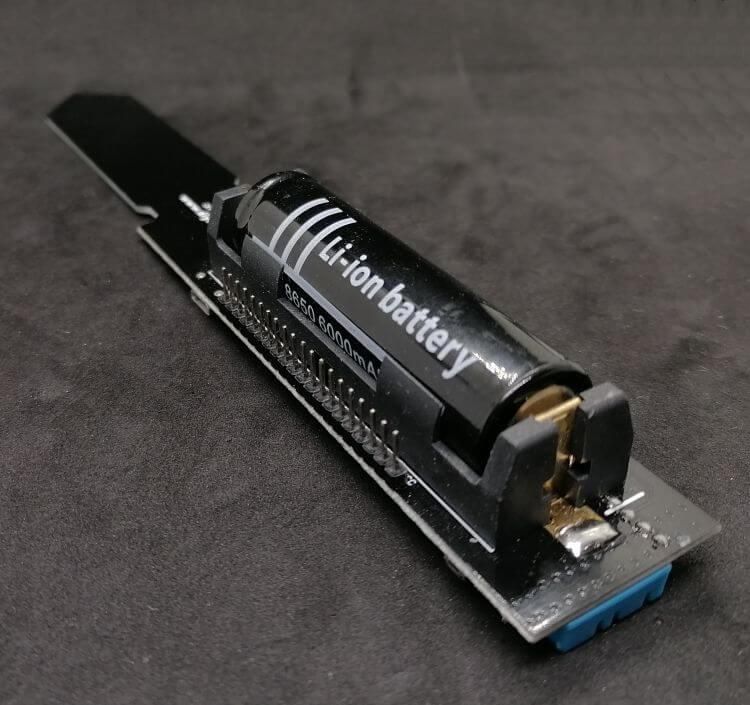 Auf der Rückseite des Bausteins ist eine Halterung für eine LiPo Batterie vom Typ 18650 angebracht, wobei die Pole jeweils mit + & – markiert sind.