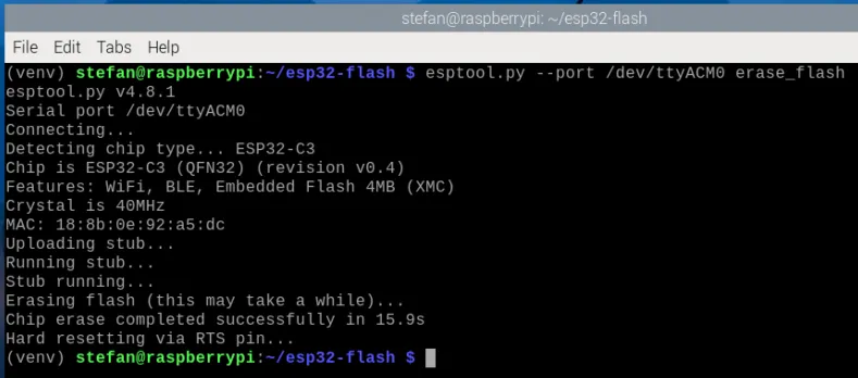 Bevor du die neue Firmware aufspielst, solltest du den internen Speicher deines ESP32-C3 vollständig löschen. Das sorgt für einen sauberen Zustand und verhindert Probleme mit alten oder beschädigten Daten auf dem Chip.
