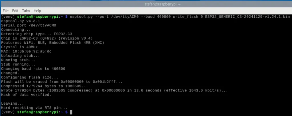 --port /dev/ttyACM0– Serieller Port deines ESP32-C3--baud 460800– Übertragungsgeschwindigkeit (schneller als Standard)write_flash 0– Startadresse im FlashESP32_GENERIC_C3-20241129-v1.24.1.bin– die MicroPython-Firmware-Datei