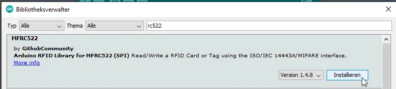 Im Bibliotheksverwalter suchst du zunächst nach „rc522“ und betätigst dann die Schaltfläche „Installieren“ im Suchergebnis „MFRC522 by GithubCommunity“.