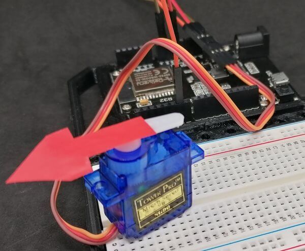 Der hier verwendete Servomotor vom Typ SG90 kann durch seine geringe Leistungsaufnahme direkt an den Mikrocontroller angeschlossen werden. Solltest du jedoch einen größeren Servomotor verwenden, dann benötigst du eine zusätzliche Stromquelle.