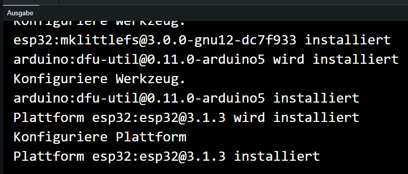Die Installation kann etwas Zeit in Anspruch nehmen, da es zahlreiche Varianten des ESP32 gibt und alle benötigten Treiber von einem eher langsamen Server heruntergeladen werden.