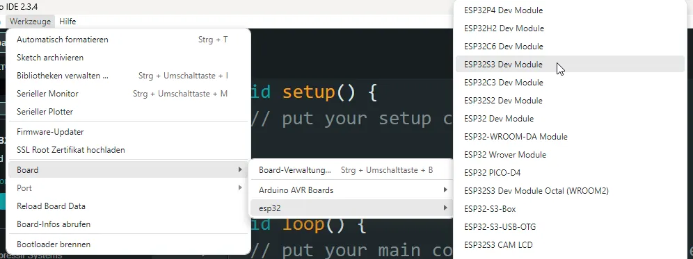 Damit sind die benötigten Boardtreiber installiert. Du findest nun unter Werkzeuge > Board > esp32 eine große Auswahl an ESP32-Boards.