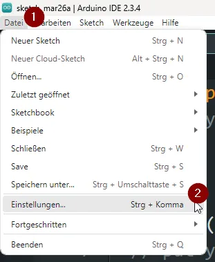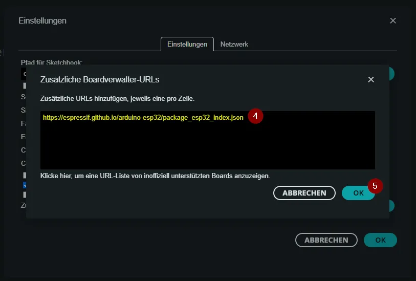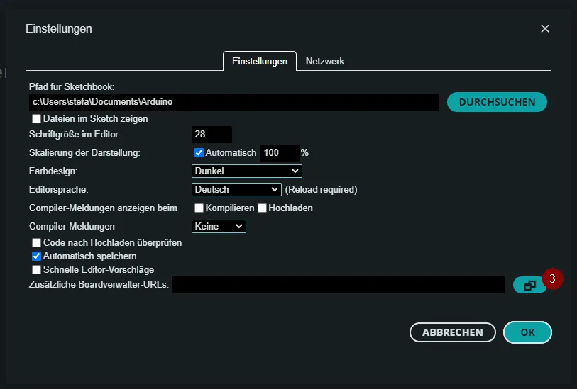 In den Einstellungen klicken wir auf die in der zweiten Grafik markierte Schaltfläche (2), um den Dialog „Zusätzliche Boardverwalter-URLs“ zu öffnen.