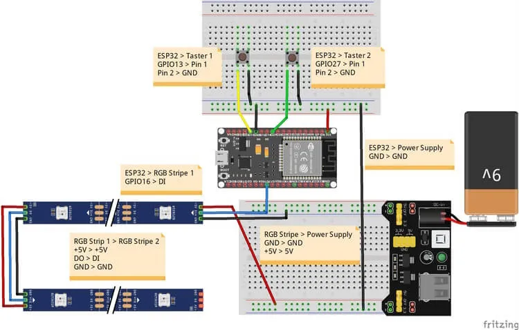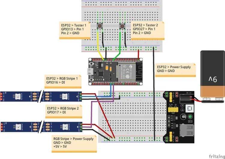 Die Schaltung ist mit zwei Taster und zwei RGB Stripes recht einfach. Der ESP32 liefert im Normalfall lediglich 3.3V, die RGB Stripes jedoch benötigen 5V, hier kann man mit einem Power Supply Modul, welches man auf ein Breadboard steckt, diese benötigte Spannung bereitstellen.
