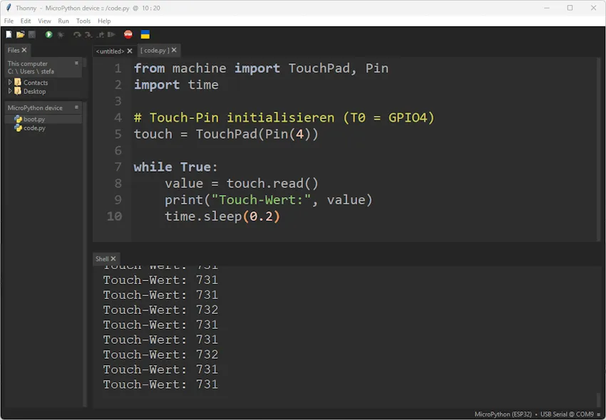 Thonny – Micropython mit ESP32 – Ausgabe der Touch-Werte