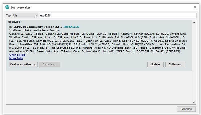 Wenn man nun den Boardverwalter („Werkzeug“ > „Board:“ > „Boardverwalter…“) öffnet kann man den Treiber unter der Eingabe der Zeichenkette „esp8266“ installieren.
