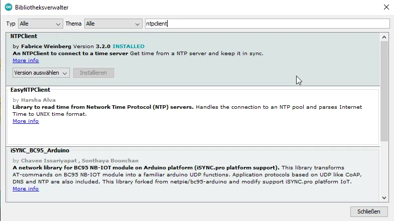 Für das Auslesen des Zeitstempels benötigen wir eine Bibliothek, welche über den Bibliotheksverwalter der Arduino IDE installiert werden kann.