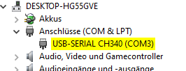 Schließen wir jetzt einmal den Mikrocontroller mit einem Micro-USB-Kabel an den Computer an. Ich verwende ein Microsoft Windows 10 (mit aktuellen Updates) und dieser wird sogleich als „USB-SERIAL CH340“ erkannt (siehe Grafik).