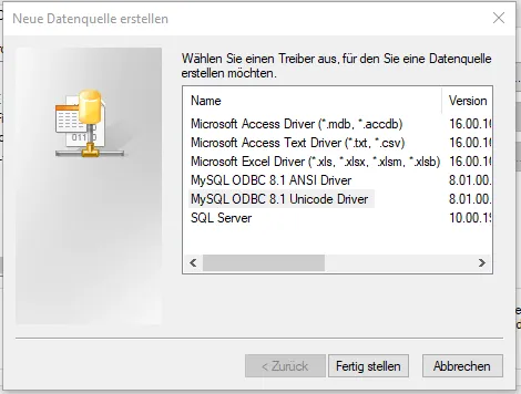 Nun wählen wir den Eintrag „MySQL ODBC 8.1 Unicode Driver“ aus und bestätigen dieses mit der Schaltfläche „Fertig stellen“.