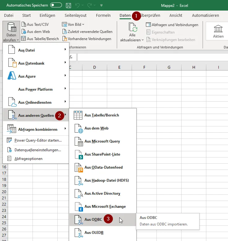 Zunächst klicken wir auf den Reiter „Daten“ (1) und dort wählen wir unter „Daten abrufen“ den Eintrag „Aus anderen Quellen“ (2) auf. Aus diesem Menü wählen wir nun den Eintrag „Aus ODBC“ (3).