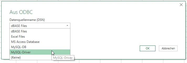 Nun müssen wir unseren zuvor eingerichteten ODBC Treiber für die MySQL Datenbank auswählen und dieses mit „OK“ bestätigen.