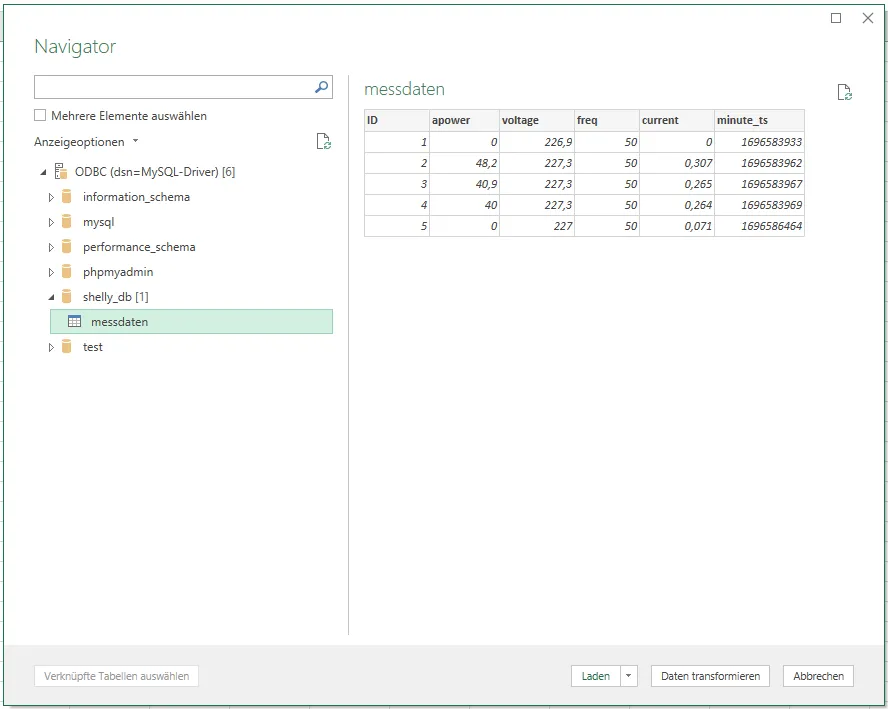 Aus dieser Liste wähle ich die Datenbank „shelly_db“ und dort die Tabelle „messdaten“ aus und bestätige die Auswahl mit der Schaltfläche „Laden“.