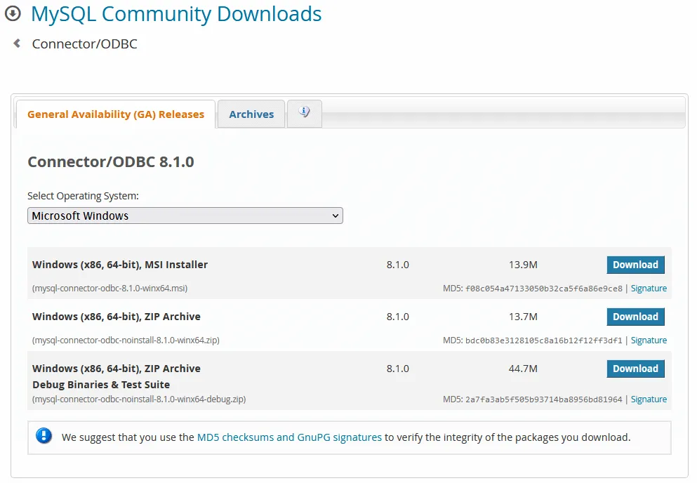 Für die Verbindung zur MySQL Datenbank benötigen wir einen Treiber, diesen können wir unter https://dev.mysql.com/downloads/connector/odbc/ herunterladen.