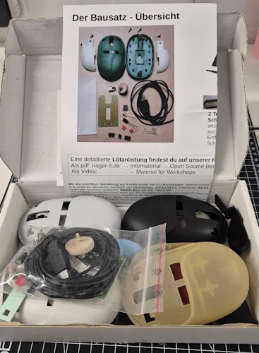 Besonders spannend finde ich, dass es die faire Computermaus nicht nur als fertiges Produkt, sondern auch als Bausatz gibt. Bei diesem Kit sind die SMD-Bauteile bereits professionell auf der Platine verlötet – dadurch bleibt der Zusammenbau auch für Einsteiger handhabbar. Die verbleibenden THT-Komponenten lassen sich problemlos selbst einlöten und bieten genau den richtigen Einstieg in die Welt der Elektronik.