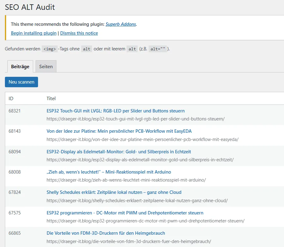 Gerade bei einem wachsenden Blog wie meinem Technikblog ist dieser Workflow zwar praktikabel, aber auf Dauer unnötig umständlich – vor allem dann, wenn man die ALT-Texte regelmäßig und nicht nur einmalig prüfen möchte.