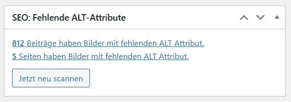 alt="Übersicht im WordPress-Dashboard mit Anzahl der Beiträge mit fehlenden ALT-Texten"