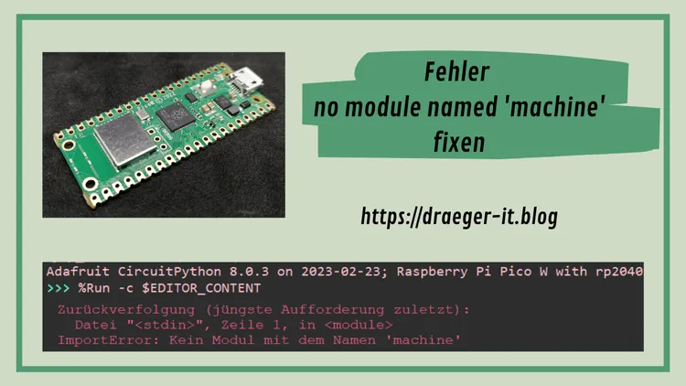 Wenn du den Fehler „no module named ‚machine'“ oder auf Deutsch „Kein Modul mit dem Namen ‚machine'“ erhältst, dann fehlt dir nicht unbedingt dieses Modul, sondern der Fehler kommt meist ganz woanders daher. Wie du diesen Fehler behebst, zeige ich dir nun anhand des Raspberry Pi Pico (W).