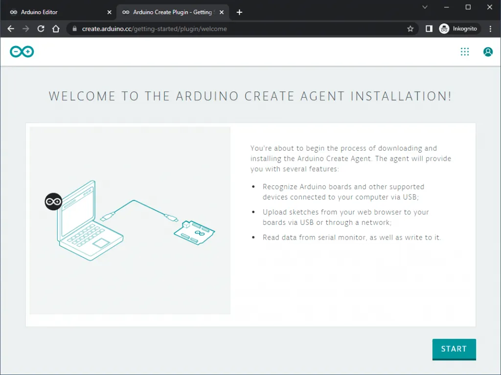 Der Browser gibt per Default keinen Zugriff auf Schnittstellen vom Computer (und das ist auch gut so), wir müssen hier ein zusätzliches Plugin installieren, welches wir von der Seite https://create.arduino.cc/getting-started/plugin/welcome herunterladen können.