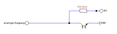 In der Schaltung schließen wir den Fototransistor mit dem kurzen Bein an den analogen Pin an und ebenfalls über einen 10 kOhm Widerstand an 5V, das lange Beinchen wird mit GND (der Masse) verbunden.