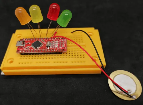 An diesen Beitrag möchte ich anknüpfen und dir zeigen, wie du das Lied Jingle Bells mit dem Piezo Summer am Arduino Nano programmierst und dabei die LEDs im Takt blinken lässt.