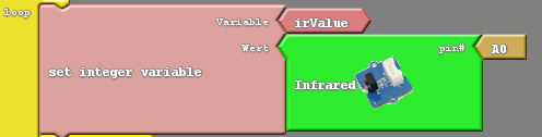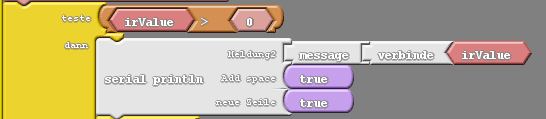 Den Wert vom eventuell betätigten Taster an der Infrarot-Fernbedienung legen wir in der ganzzahligen Variablen „irValue“ ab.