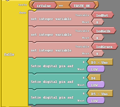 Die Taste „OK“ auf der Fernbedienung möchte ich als Reset-Taste nutzen, dazu habe ich zunächst den Wert ausgelesen und in die Variable „TASTE_OK“ abgelegt. Wenn also nun der Wert der „irValue“ gleich dem Wert der Variable „TASTE_OK“ ist, dann werden alle Status auf 0 gesetzt und die LEDs deaktiviert.