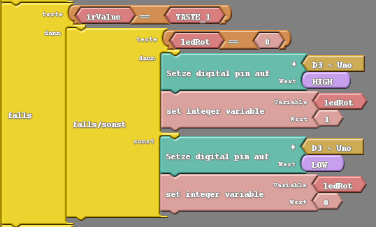 In meinem Fall habe ich den Wert der Taste 1 der roten LED zugeordnet, d.h. wenn diese Taste betätigt wird, dann soll die rote LED aktiviert bzw. deaktiviert werden.