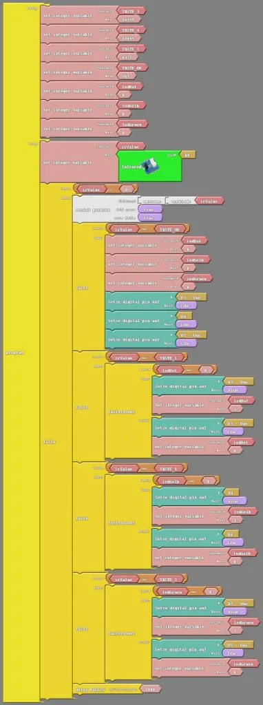 Natürlich kannst du dieses Programm auch mit der Arduino IDE per Hand programmieren, d.h. in C/C++. Aber ich finde diese Möglichkeit der Programmierung von solch kleinen Programmen sehr interessant.