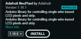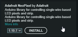 Der Weg über den Bibliotheksverwalter der Arduino IDE ist deutlich einfacher, denn dort braucht man nur nach „Adafruit NeoPixel“ suchen und an dem entsprechenden Eintrag die Schaltfläche „INSTALL“ klicken.